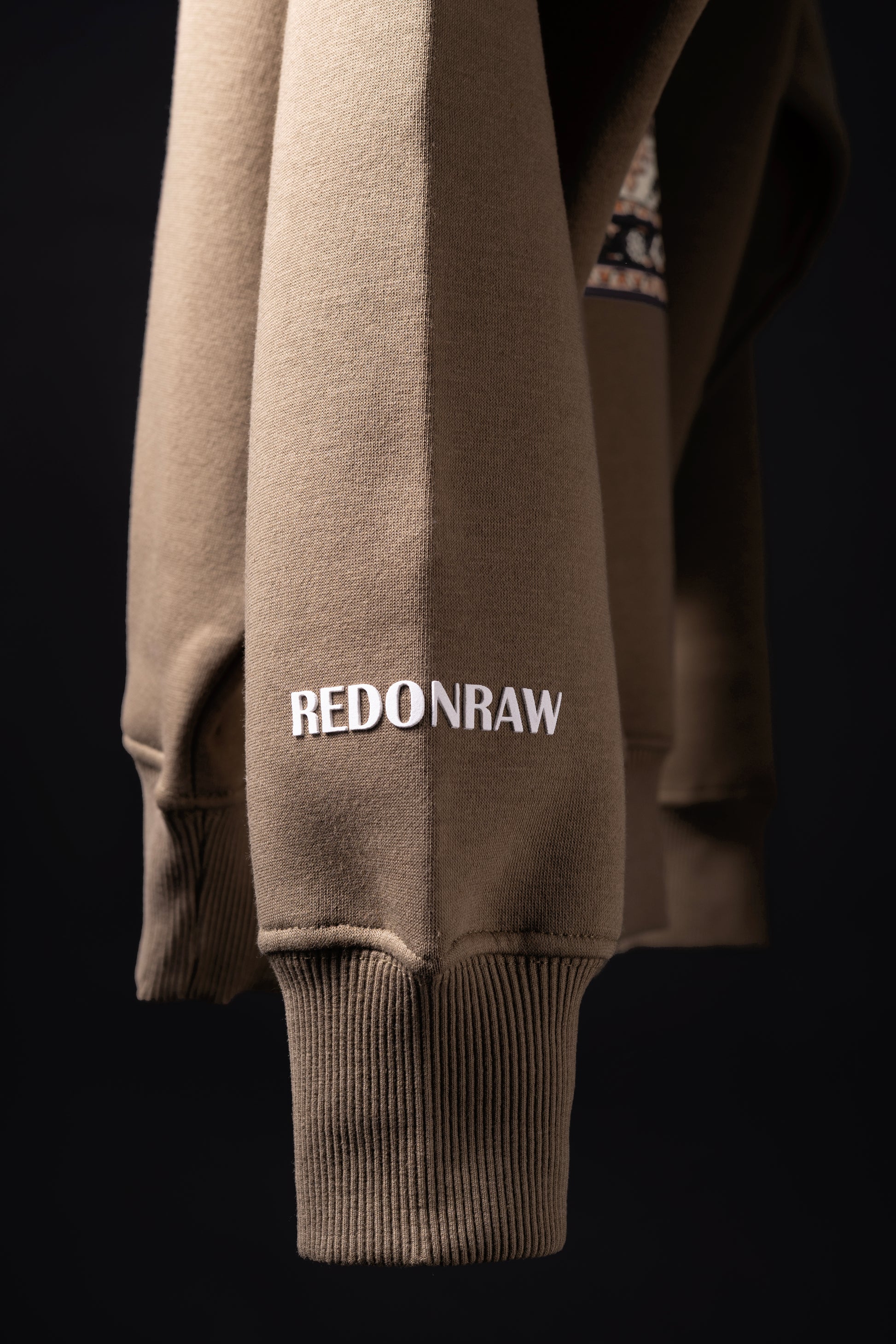 EACH THREAD OF THE BACK GRAPHIC ECHOES CENTURIES OF TRADITION, REINTERPRETED IN BOLD PUFF SCREEN PRINT TO GIVE IT DEPTH — BOTH LITERALLY AND METAPHORICALLY. THIS ISN'T JUST PRINT — IT'S HERITAGE EMBOSSED IN COTTON. THE FRONT AND SLEEVE BRANDING SERVE AS ANCHORS, GROUNDING THE PIECE IN REDONRAW’S UNAPOLOGETIC IDENTITY. ONE SPEAKS WITH WEIGHT; THE OTHER WHISPERS PRECISION — PUFF PRINT MEETS HIGH-DENSITY INK, BALANCING HERITAGE AND INNOVATION.