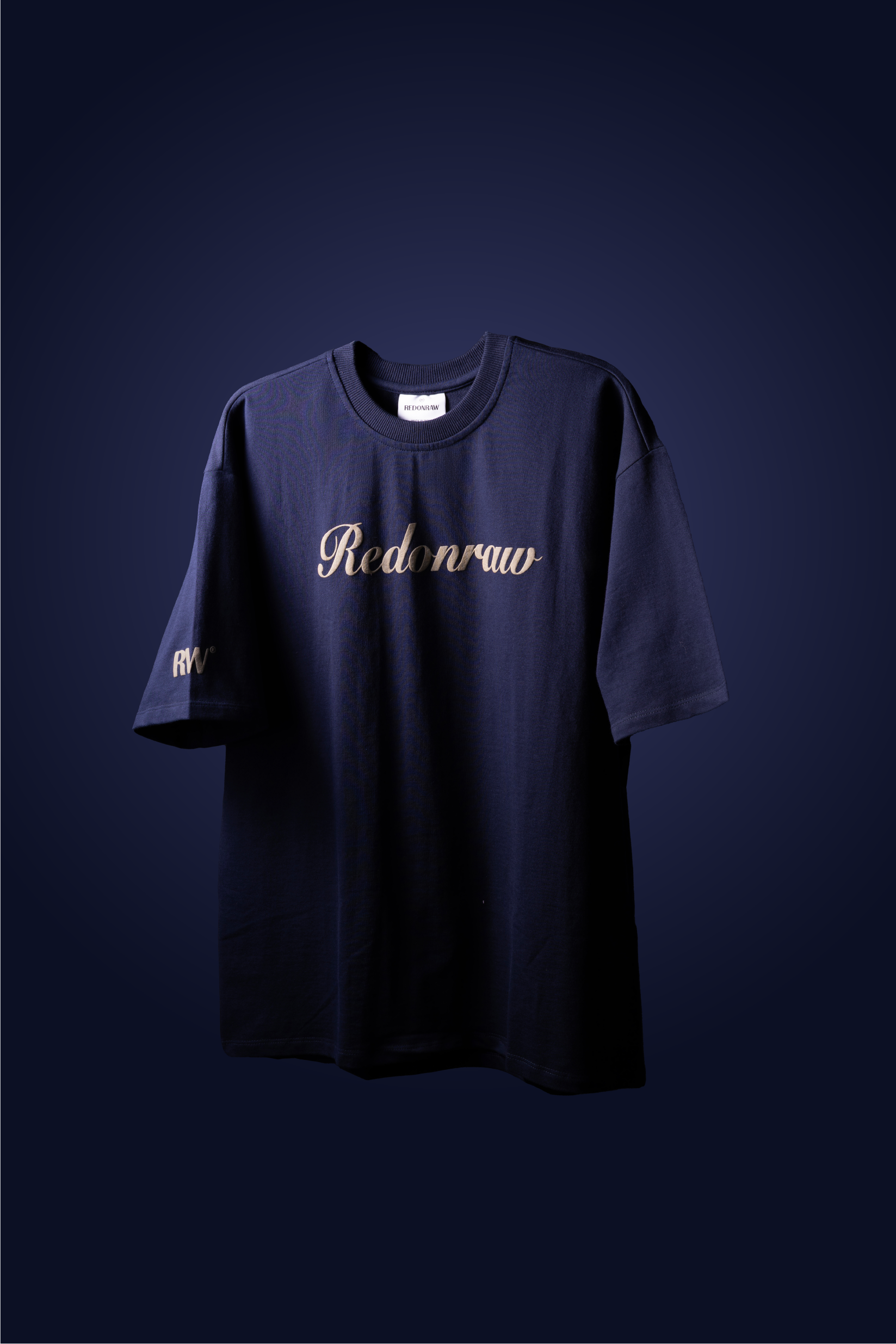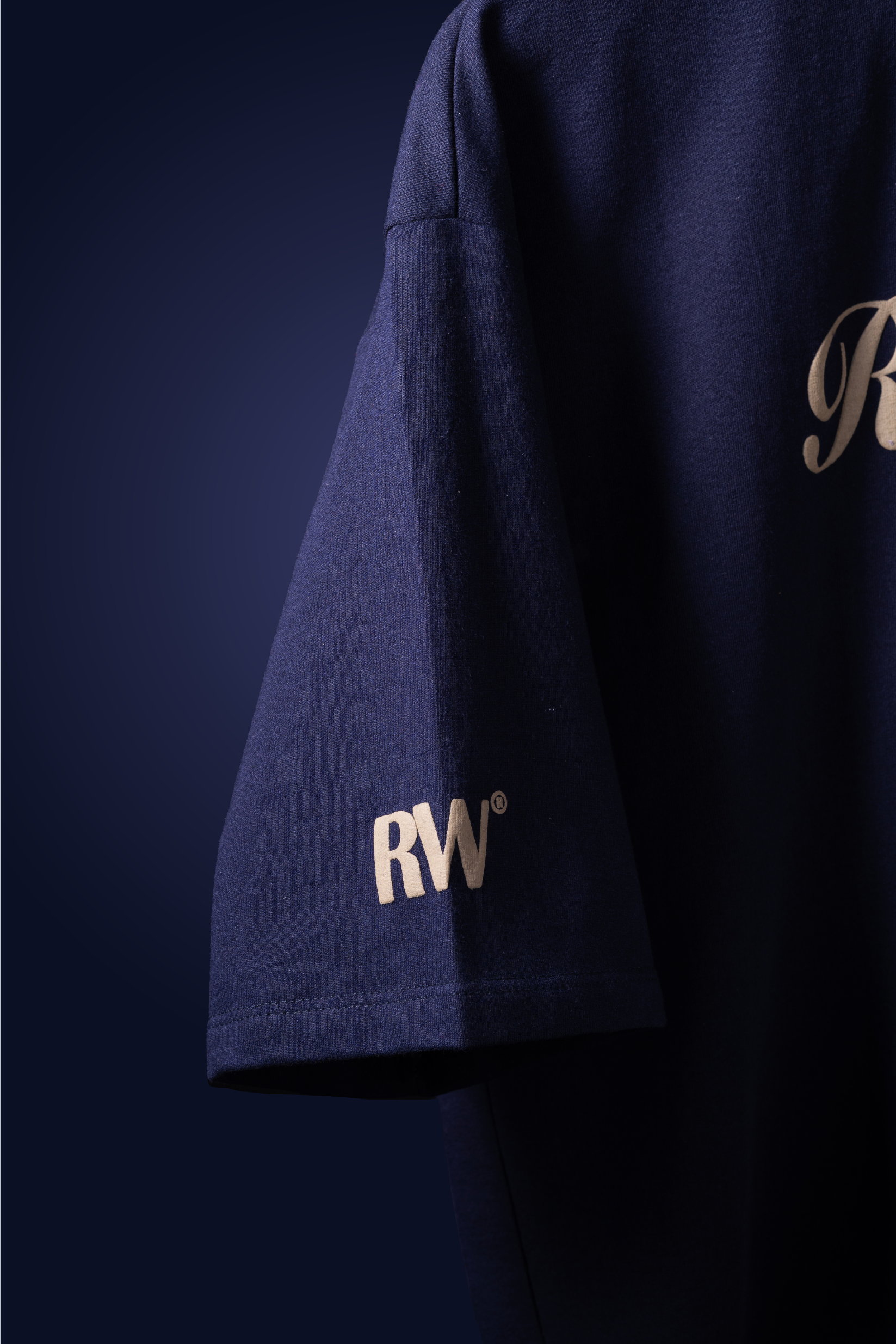 OVERSIZED T-SHIRT IN NAVY BLUE WITH ROUND NECKLINE AND OFF DROP SHOULDERS. CAMEL COLOUR PUFF PRINT ON FRONT AND SLEEVES WITH TWELVE COLOUR DENSE PRINT ON BACK.